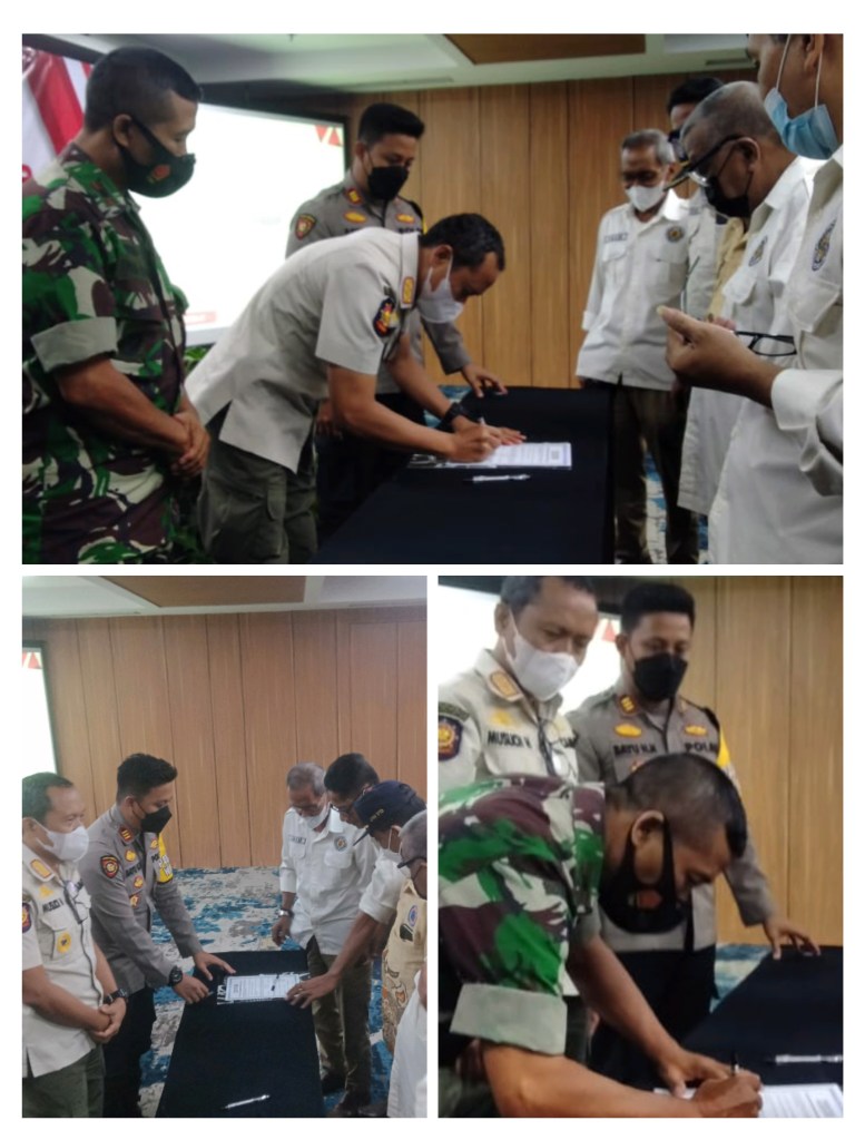 Penanda tanganan MOU Deklarasi damai dan aman di wilayah Kecamatan Wonocolo oleh 3 pilar dan ketua LPMK Kecamatan Wonocolo yang disaksikan oleh Lurah,ketua RW Se Kecamatan Wonocolo berjalan lancar dan aman para undangan wajib gunakan masker ( Kim Margo )